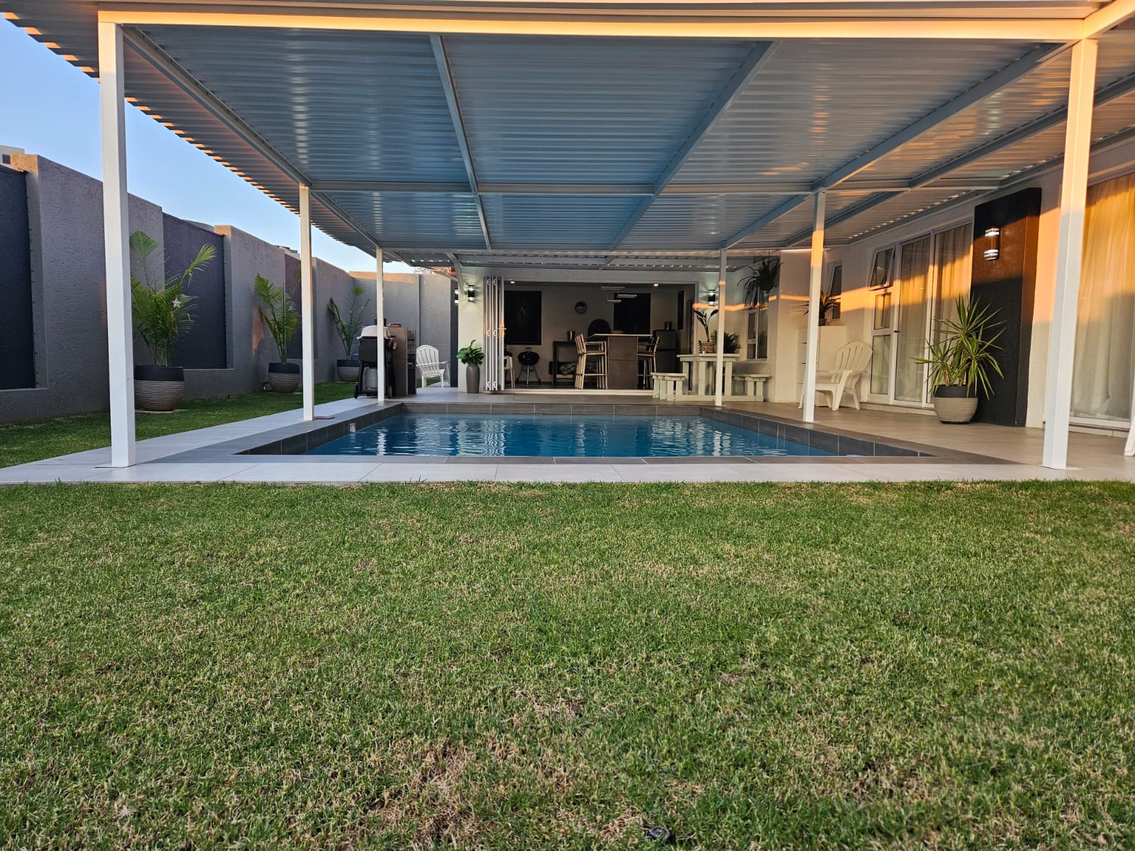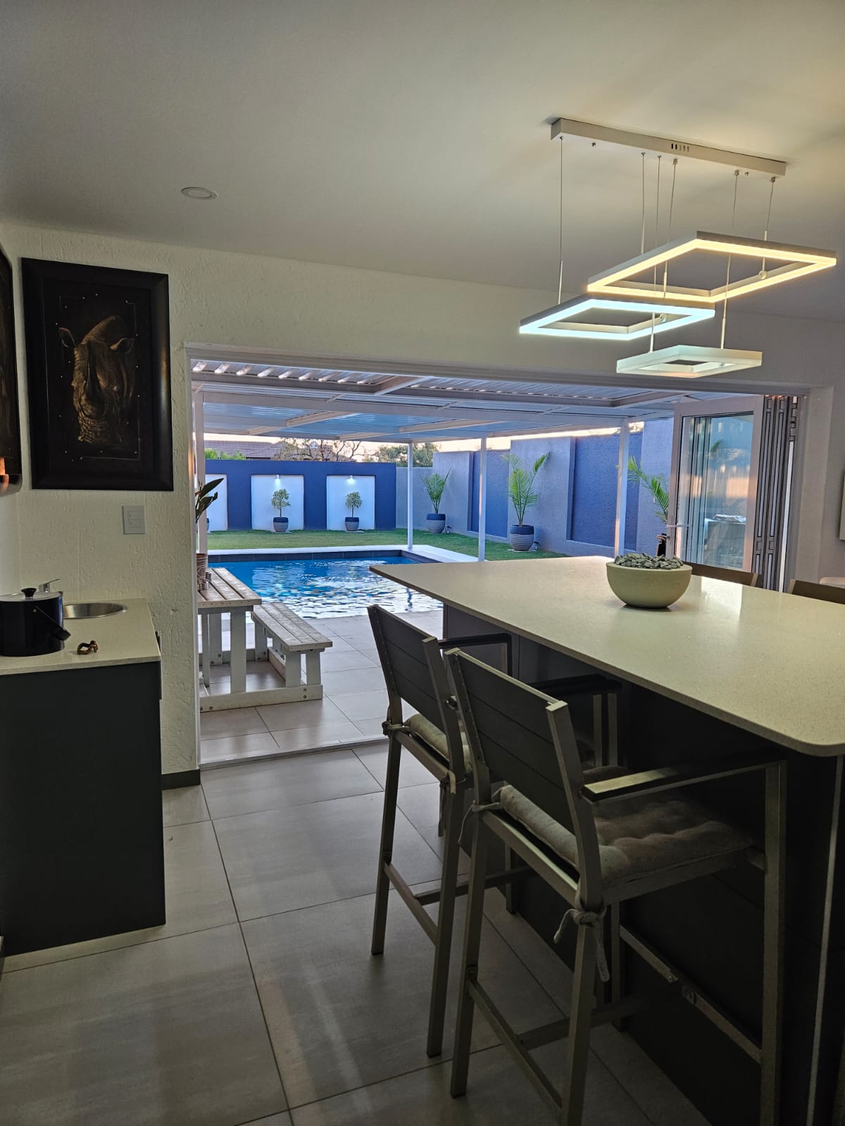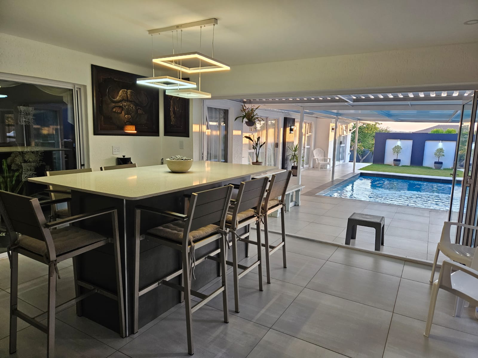 The bar area leads to the patio and under roof swimming pool and braai areas inside and outside..